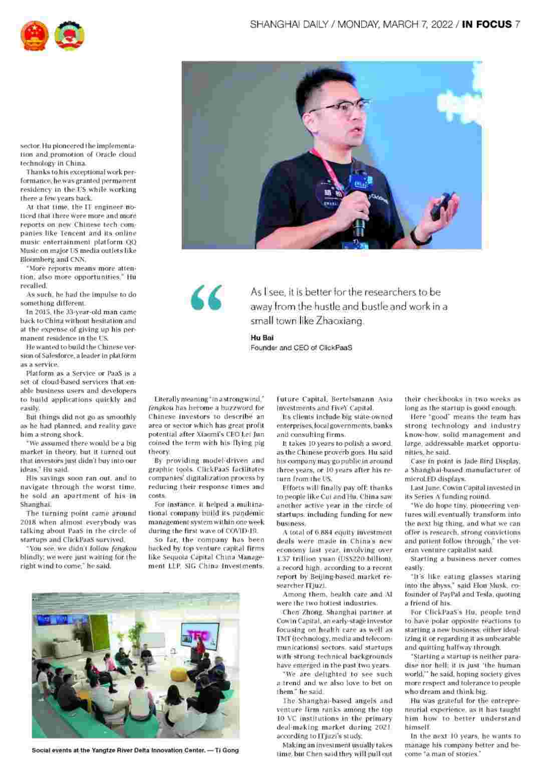 《上海日报》专访CGPAY钱包创始人、、CEO胡柏,,,探究其创业背后的故事!!